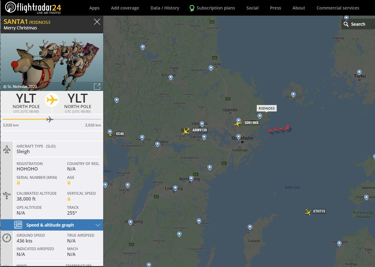 Så här såg det ut strax före 21.30 lokal tid när tomten var på väg in mot Stockholm på flygnivå 380, dvs 38000 fot i 436 knop, strax över 800 km/h. Det är tuffa renar han har!