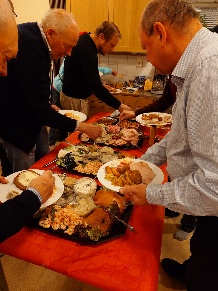 I år hade vi tagit ett nytt grepp vad gällde julbordet. Förra året hade vi beställt färdiga jultallrikar. I år beställde vi "Julbuffe" som catering från City Gross i Länna. Det var mycket lyckat. Vi kunde värma det som skulle vara varmt i ugnen i lokalen. Sill, räkor, lax mm låg upplagt på ett fat. Det kallskurna på ett annat och det varma i formar bredvid. Vi hade kompletterat med bröd, smör och diverse alkoholfria drycker följt av kaffe, chokladpraliner och skumtomtar.